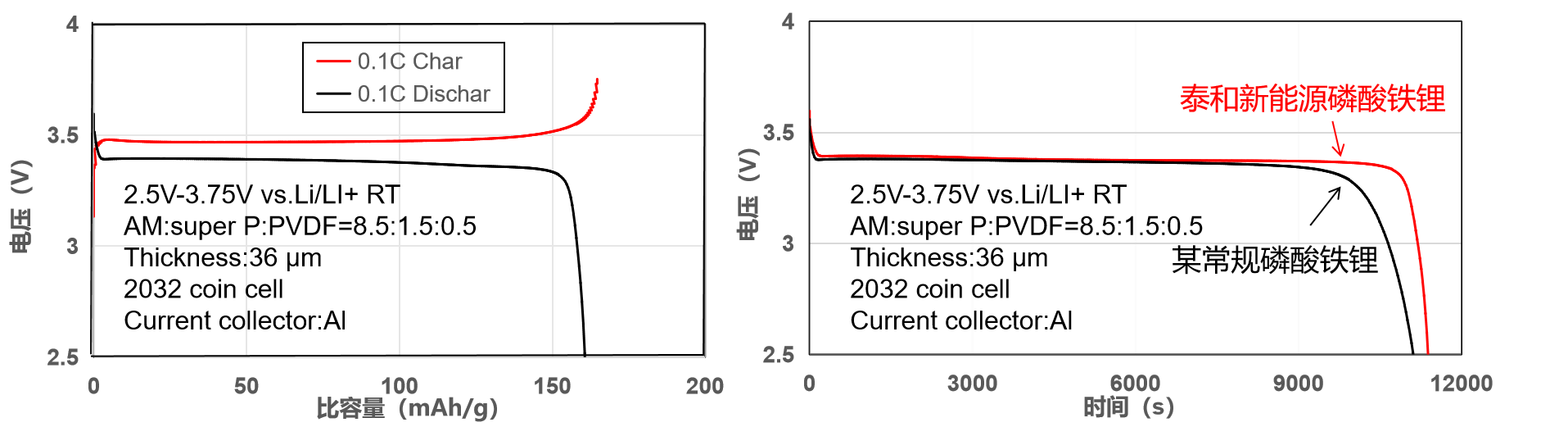 圖1扣電充放電曲線 圖2 扣電放電電壓曲線對(duì)比(0.1C)